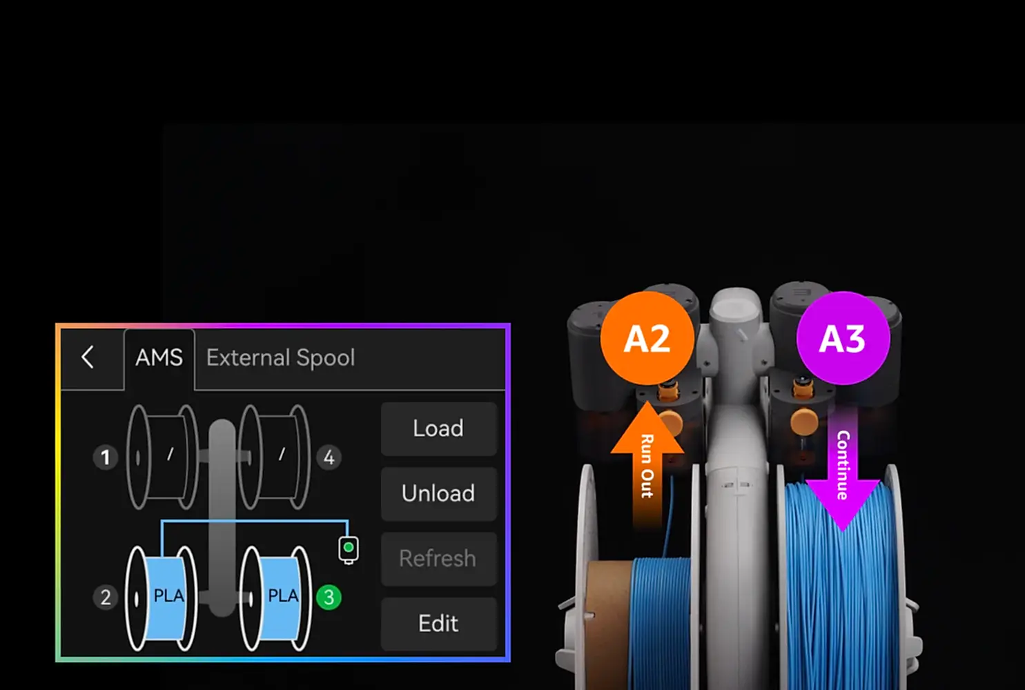 AMS lite ile, mevcut makara bittiğinde yeni makaraları sorunsuz bir şekilde yüklemek için otomatik filament yedeklemesi ayarlayabilirsiniz. Kesintisiz bir baskı süreci sağlar ve ayrıca manuel makara değişimi nedeniyle filament israfını önler.